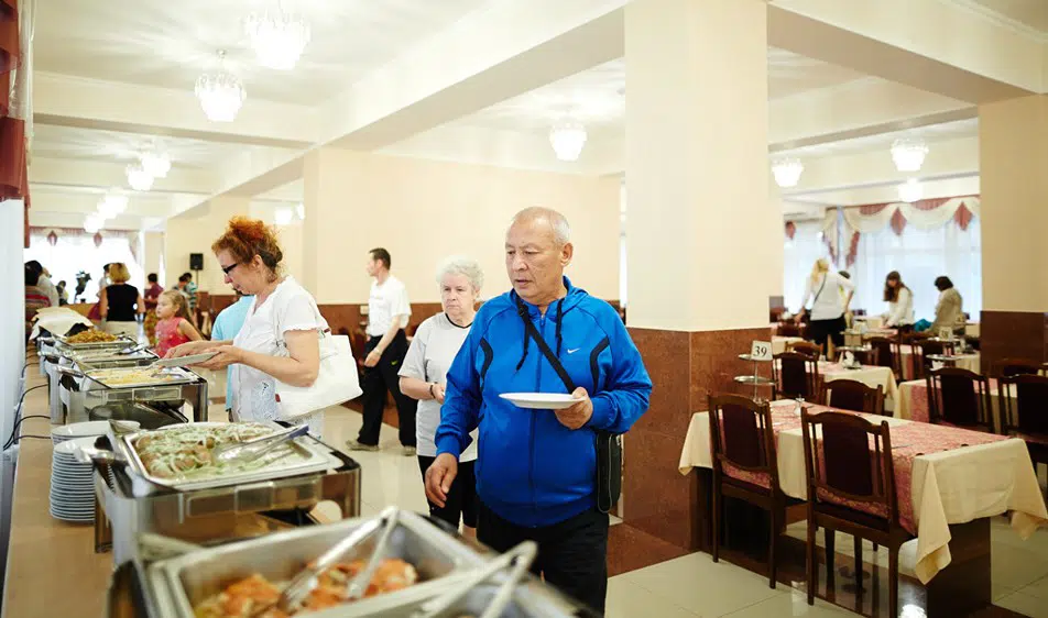 Меню ресторана включает в себя обширный перечень разнообразных блюд, разработанных высококвалифицированными поварами санатория. Это всевозможные холодные и горячие закуски, овощные, рыбные и мясные блюда, салаты, свежие овощи, фрукты и кондитерские изделия способные удовлетворить любой изысканный вкус.